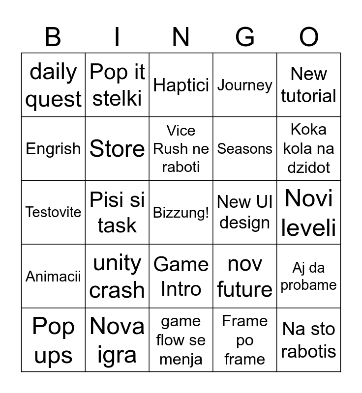 This bingo card has a free space and 24 words: Pop ups, unity crash, Vice Rush ne raboti, Frame po frame, New tutorial, daily quest, Pop it stelki, Haptici, New UI design, Novi leveli, Testovite, Store, nov future, Aj da probame, Engrish, Nova igra, game flow se menja, Journey, Koka kola na dzidot, Animacii, Pisi si task, Game Intro, Seasons and Na sto rabotis.