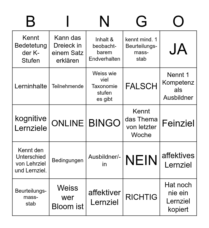 This bingo card has a free space and 24 words: Bedingungen, Weiss wer Bloom ist, Weiss wie viel Taxonomie stufen es gibt, Beurteilungs- mass- stab, JA, Kennt Bedetetung der K-Stufen, Lerninhalte, Kann das Dreieck in einem Satz erklären, Kennt das Thema von letzter Woche, Ausbildner/-in, FALSCH, kognitive Lernziele, NEIN, affektives Lernziel, Teilnehmende, RICHTIG, Feinziel, Inhalt & beobacht- barem Endverhalten, Nennt 1 Kompetenz als Ausbildner, ONLINE, Hat noch nie ein Lernziel kopiert, Kennt den Unterschied von Lehrziel und Lernziel., kennt mind. 1 Beurteilungs- mass- stab and affektiver Lernziel.