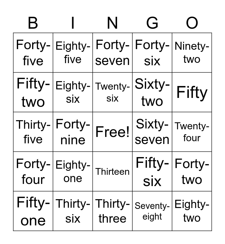 This bingo card has a free space and 90 words: Eleven, Twelve, Thirteen, Fourteen, Fifteen, Sixteen, Seventeen, Eighteen, Nineteen, Twenty, Twenty-one, Twenty-two, Twenty-three, Twenty-four, Twenty-five, Twenty-six, Twenty-seven, Twenty-eight, Twenty-nine, Thirty, Thirty-one, Thirty-two, Thirty-three, Thirty-four, Thirty-five, Thirty-six, Thirty-seven, Thirty-eight, Thirty-nine, Forty, Forty-one, Forty-two, Forty-three, Forty-four, Forty-five, Forty-six, Forty-seven, Forty-eight, Forty-nine, Fifty, Fifty-one, Fifty-two, Fifty-three, Fifty-four, Fifty-five, Fifty-six, Fifty-seven, Fifty-eight, Fifty-nine, Sixty, Sixty-one, Sixty-two, Sixty-three, Sixty-four, Sixty-five, Sixty-six, Sixty-seven, Sixty-eight, Sixty-nine, Seventy, Seventy-one, Seventy-two, Seventy-three, Seventy-four, Seventy-five, Seventy-six, Seventy-seven, Seventy-eight, Seventy-nine, Eighty, Eighty-one, Eighty-two, Eighty-three, Eighty-four, Eighty-five, Eighty-six, Eighty-seven, Eighty-eight, Eighty-nine, Ninety, Ninety-one, Ninety-two, Ninety-three, Ninety-four, Ninety-five, Ninety-six, Ninety-seven, Ninety-eight, Ninety-nine and One hundred.