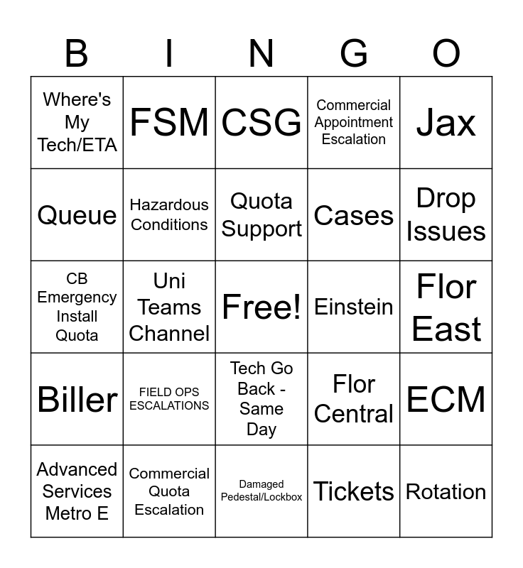 This bingo card has a free space and 28 words: ECM, Chats, Cases, Tickets, Queue, CSG, FSM, Biller, Einstein, Advanced Services Metro E, CB Emergency Install Quota, Commercial Appointment Escalation, Commercial Quota Escalation, Damaged Pedestal/Lockbox, Drop Issues, ECR Appointment Escalation, FIELD OPS ESCALATIONS, Hazardous Conditions, Quota Support, Tech Go Back - Same Day, Where's My Tech/ETA, Xfinity Home Service Escalation, Rotation, Uni Teams Channel, Flor East, Flor Central, Jax and Mia.