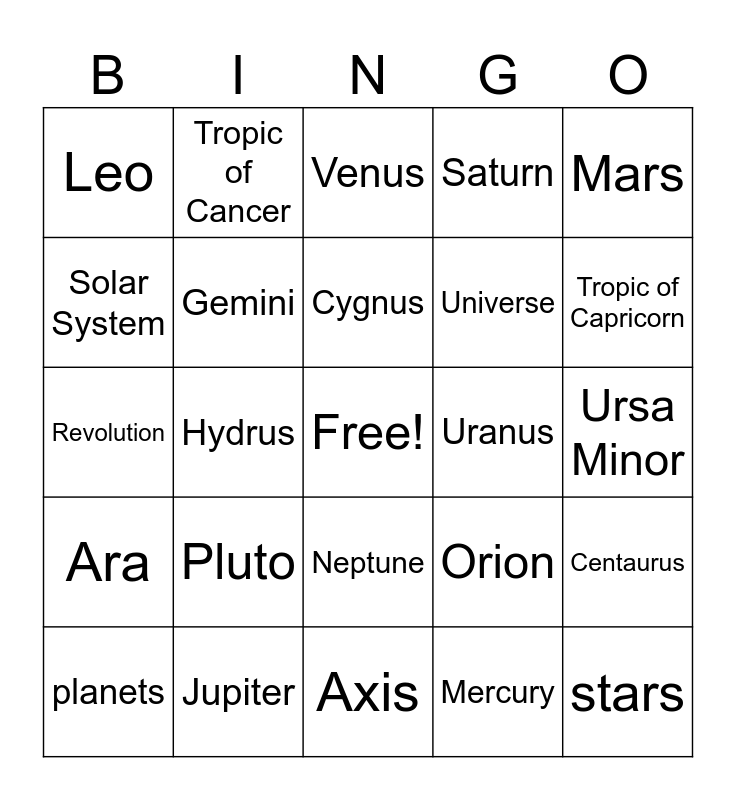 This bingo card has a free space and 45 words: constellations, stars, sun, planets, moon, Mercury, Venus, Earth, Mars, Jupiter, Saturn, Uranus, Neptune, Pluto, Polaris, Axis, Orbit, Revolution, Equator, Tropic of Capricorn, Tropic of Cancer, Northern Hemisphere, Southern Hemisphere, Leo, Ursa Major, Ursa Minor, Summer solstice, Winter solstice, Orion, Ara, Sagittarius, Centaurus, Scorpius, Pegasus, Taurus, Hydrus, Aries, Lepus, Chamaelon, Cygnus, Solar System, Universe, Galexy, Gemini and Titan.