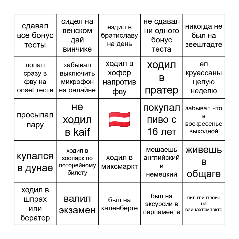 This bingo card has a free space and 24 words: ходил в зоопарк по лоторейному билету, валил экзамен, ходил в хофер напротив фву, ходил в шпрах или бератер, никогда не был на зеештадте, сдавал все бонус тесты, попал сразу в фву на onset тесте, сидел на венском дай винчике, покупал пиво с 16 лет, ходил в миксмаркт, ходил в пратер, просыпал пару, мешаешь английский и немецкий, живешь в общаге, забывал выключить микрофон на онлайне, был на эксурсии в парламенте, забывал что в воскресенье выходной, ездил в братиславу на день, ел круассаны целую неделю, не ходил в kaіf, пил глинтвейн на вайнахтсмаркте, купался в дунае, не сдавал ни одного бонус теста and был на каленберге.