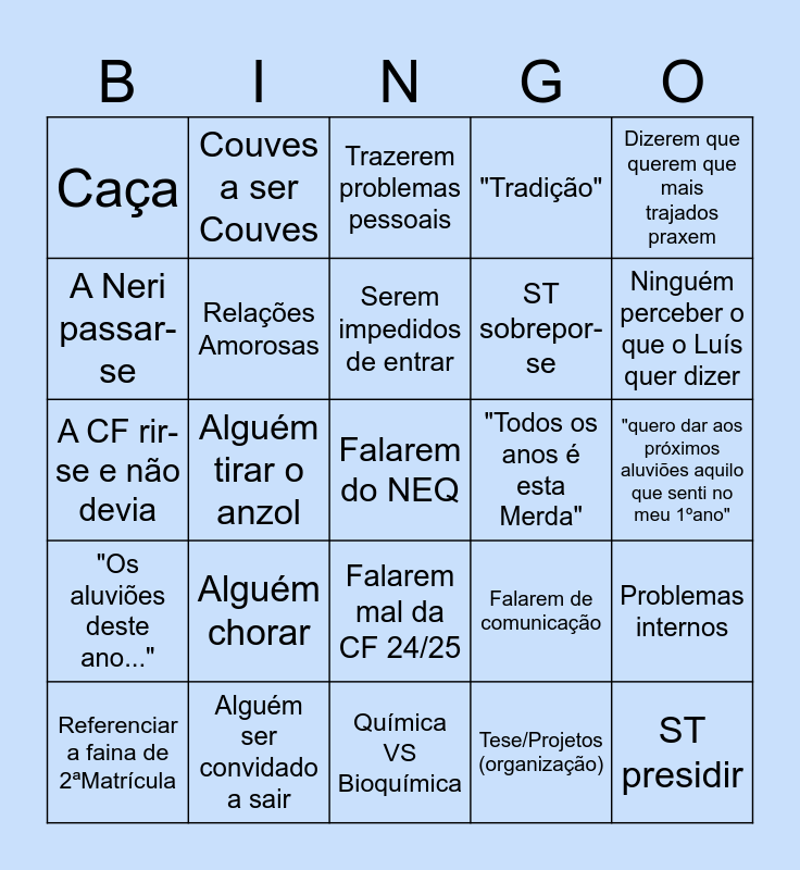 This bingo card has a free space and 24 words: Alguém chorar, Alguém ser convidado a sair, Serem impedidos de entrar, Referenciar a faina de 2ªMatrícula, Dizerem que querem que mais trajados praxem, Caça, A Neri passar-se, Couves a ser Couves, "Todos os anos é esta Merda", Falarem mal da CF 24/25, ST sobrepor-se, A CF rir-se e não devia, Falarem de comunicação, Problemas internos, Relações Amorosas, Tese/Projetos (organização), "quero dar aos próximos aluviões aquilo que senti no meu 1ºano", Trazerem problemas pessoais, Ninguém perceber o que o Luís quer dizer, Alguém tirar o anzol, ST presidir, "Os aluviões deste ano...", "Tradição" and Química VS Bioquímica.