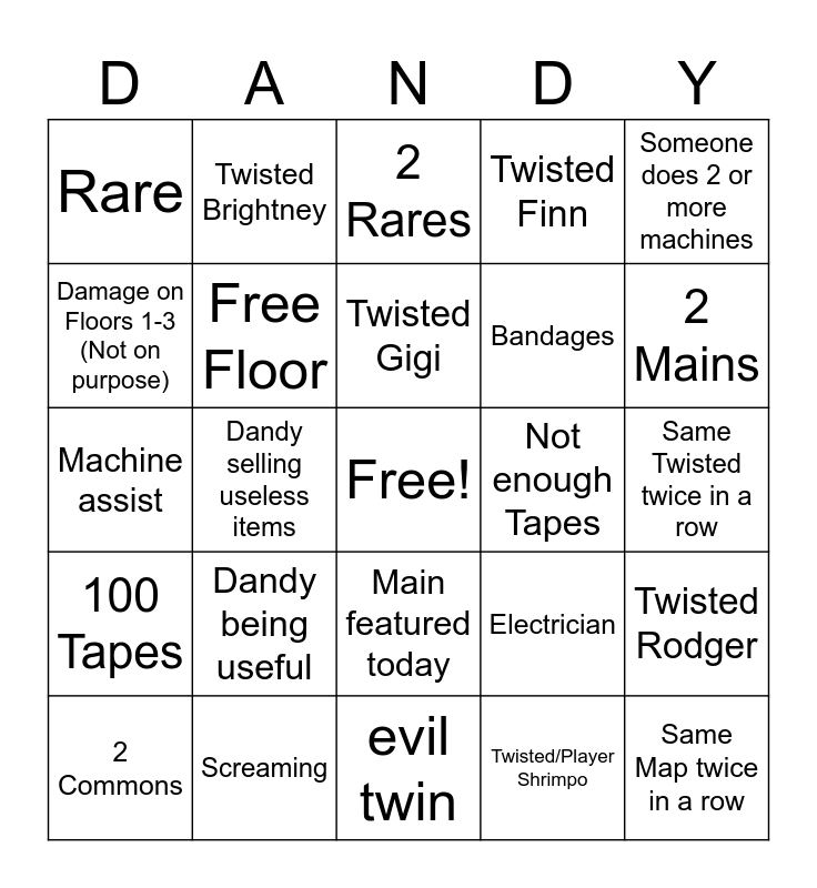 This bingo card has a free space and 29 words: 2 Commons, Main Twisted, Dandy selling useless items, Blackout, Rare, 2 Rares, Free Floor, Dandy being useful, Not enough Tapes, Screaming, Same Twisted twice in a row, Same Map twice in a row, evil twin, Twisted/Player Shrimpo, 2 Mains, Latest Twisted added, Main featured today, 100 Tapes, Someone does 2 or more machines, Machine assist, Electrician, Rare Item, Bandages, Damage on Floors 1-3 (Not on purpose), Twisted Finn, Twisted Brightney, Twisted Rodger, Twisted Gigi and Twisted Vee.