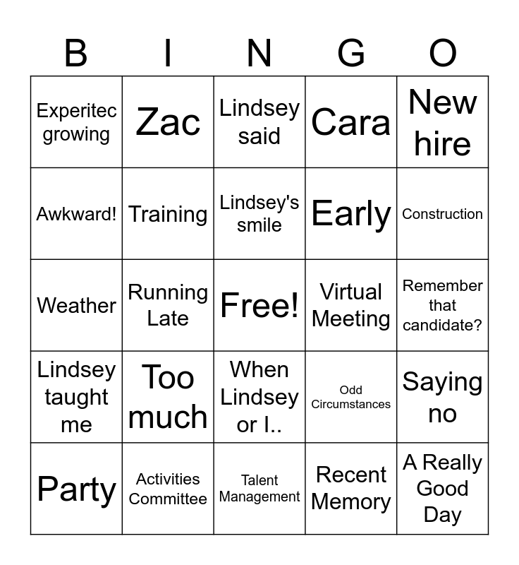 This bingo card has a free space and 29 words: Party, Fun Times, Running Late, Silly, Experitec growing, Lindsey said, Training, Too much, Virtual Meeting, Activities Committee, Remember that candidate?, A Really Good Day, Talent Management, Recent Memory, Construction, Who?, When Lindsey or I.., Lindsey taught me, New hire, Weather, Odd Circumstances, Teamwork, Early, Awkward!, Cara, Zac, Saying no, Lindsey's smile and Coincidence.