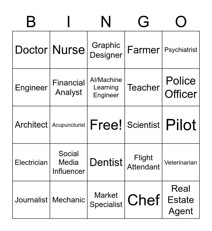 This bingo card has a free space and 28 words: Veterinarian, Software Developer, Teacher, Chef, Engineer, Graphic Designer, Nurse, Electrician, Scientist, Journalist, Architect, Farmer, Mechanic, Market Specialist, Police Officer, Environmentalist, Social Media Influencer, Financial Analyst, AI/Machine Learning Engineer, Dentist, Doctor, Professional Athlete, Real Estate Agent, Acupuncturist, Pilot, Flight Attendant, Psychiatrist and Psychotherapist.
