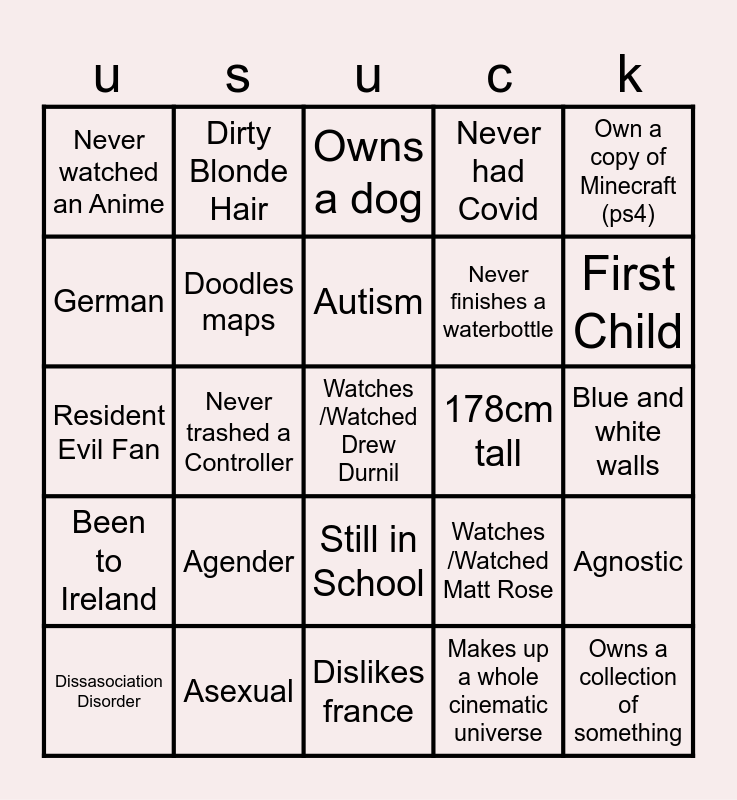 This bingo card has a free space and 24 words: Agender, Asexual, Autism, Dissasociation Disorder, Own a copy of Minecraft (ps4), Never watched an Anime, German, Dirty Blonde Hair, 178cm tall, Still in School, Never finishes a waterbottle, Resident Evil Fan, Watches /Watched Matt Rose, Agnostic, Doodles maps, Makes up a whole cinematic universe, Blue and white walls, Owns a dog, First Child, Never trashed a Controller, Owns a collection of something, Been to Ireland, Never had Covid and Dislikes france.