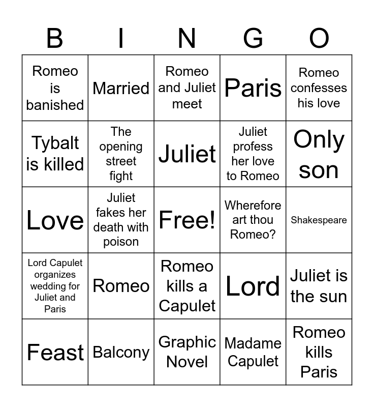 Romeo And Juliet Bingo | Romeo & Juliet | Romeo & Juliet | Romeo and Juliet Bingo | Romeo and Juliet Bingo