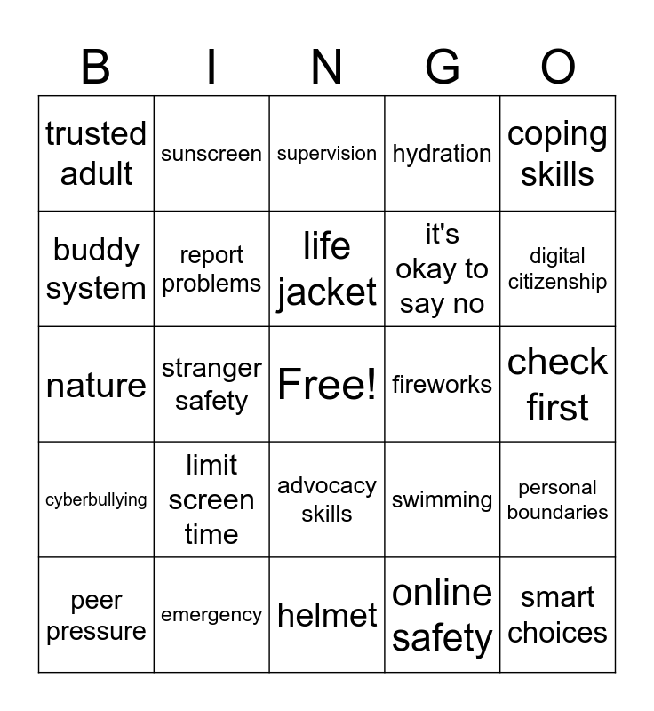 This bingo card has a free space and 24 words: limit screen time, emergency, life jacket, peer pressure, coping skills, trusted adult, buddy system, sunscreen, fireworks, advocacy skills, it's okay to say no, nature, swimming, personal boundaries, report problems, online safety, check first, supervision, digital citizenship, stranger safety, smart choices, cyberbullying, hydration and helmet.