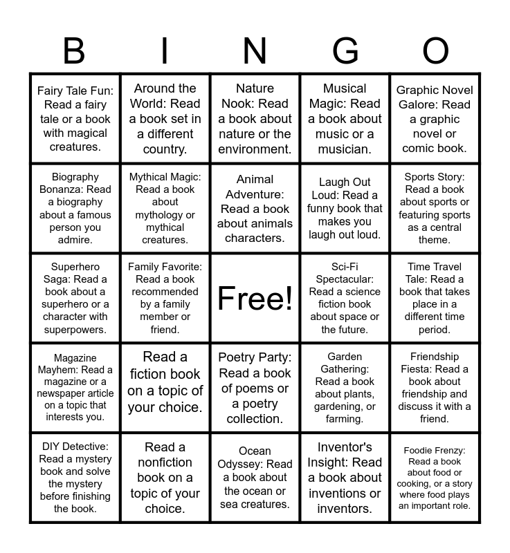 This bingo card has a free space and 24 words: Read a fiction book on a topic of your choice., Read a nonfiction book on a topic of your choice., Animal Adventure: Read a book about animals characters., DIY Detective: Read a mystery book and solve the mystery before finishing the book., Graphic Novel Galore: Read a graphic novel or comic book., Fairy Tale Fun: Read a fairy tale or a book with magical creatures., Biography Bonanza: Read a biography about a famous person you admire., Around the World: Read a book set in a different country., Sci-Fi Spectacular: Read a science fiction book about space or the future., Poetry Party: Read a book of poems or a poetry collection., Laugh Out Loud: Read a funny book that makes you laugh out loud., Superhero Saga: Read a book about a superhero or a character with superpowers., Garden Gathering: Read a book about plants, gardening, or farming., Friendship Fiesta: Read a book about friendship and discuss it with a friend., Mythical Magic: Read a book about mythology or mythical creatures., Inventor's Insight: Read a book about inventions or inventors., Time Travel Tale: Read a book that takes place in a different time period., Nature Nook: Read a book about nature or the environment., Sports Story: Read a book about sports or featuring sports as a central theme., Family Favorite: Read a book recommended by a family member or friend., Foodie Frenzy: Read a book about food or cooking, or a story where food plays an important role., Magazine Mayhem: Read a magazine or a newspaper article on a topic that interests you., Musical Magic: Read a book about music or a musician. and Ocean Odyssey: Read a book about the ocean or sea creatures..