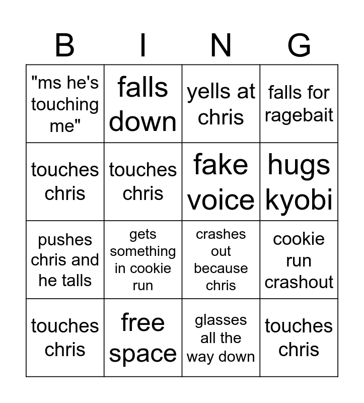This bingo card has 20 words: touches chris, pushes chris, yells at chris, cookie run crashout, "why did you delete the game, gets something in cookie run, glasses all the way down, falls for ragebait, pushes chris and he talls, falls down, crashes out because chris, hugs kyobi, "ms he's touching me", free space, fake voice, chipmunk crashout, touches chris, touches chris, touches chris and touches chris.