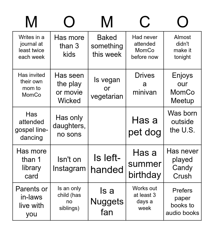 This bingo card has a free space and 49 words: Speaks another language fluently, Attended MOMCON, Currently potty-training a kiddo, Works out at least 3 days a week, Was born outside the U.S., Has run the Colfax Marathon, Has more than 3 kids, Has a newborn (under 6 months), Drives a minivan, Plays a musical instrument well, Has invited their own mom to MomCo, Has only daughters, no sons, Has a summer birthday, Prefers paper books to audio books, Is a stepmom, Lives with a parent or parent-in-law, Baked something this week, Has a pet dog, Buys clothes at Costco, Writes in a journal at least twice each week, Is an only child (has no siblings), Is a Nuggets fan, Had never attended MomCo before now, Almost didn't make it tonight, Doesn't have Facebook, Isn't on Instagram, Is vegan or vegetarian, Has traveled outside Colorado in May, Has never played Candy Crush, Has more than 1 library card, Has a vegetable garden, Is left-handed, Crochets or knits regularly, Has eaten at Mango House, Parents or in-laws live with you, Serves at CCC, Has been on a missions trip, Has prayed for a CCC mission trip, Enjoys our MomCo Meetup, Has invited someone to our MomCo Meetup, Has only sons, no daughters, Has grandkids, Has a grandparent who is alive, Works full-time, Has attended gospel line-dancing, Has seen the play or movie Wicked, Attended the Boo Thang Meetup, Has gone bowling in 2025 and Has gone roller skating in 2025.