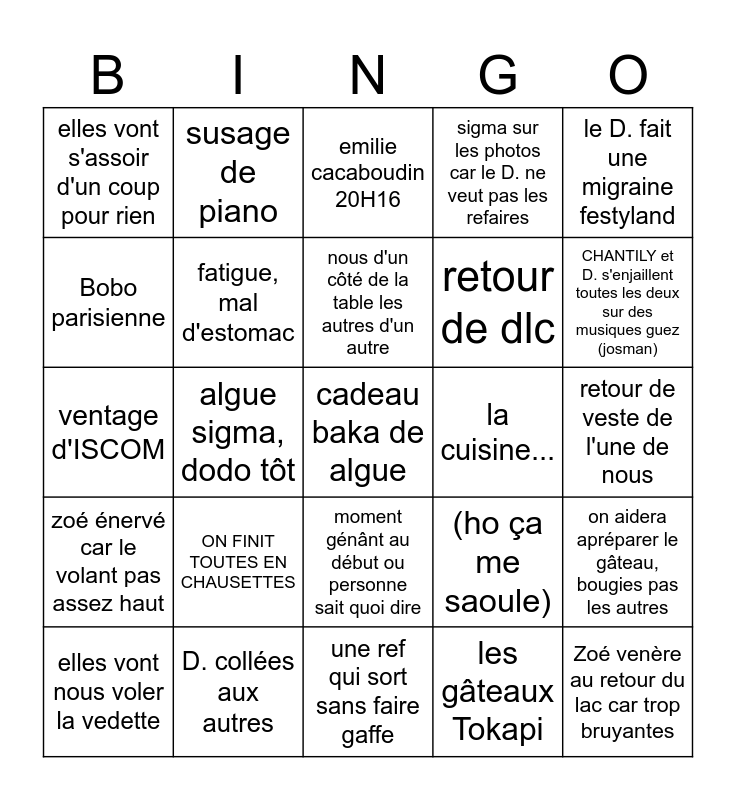 This bingo card has a free space and 24 words: ON FINIT TOUTES EN CHAUSETTES, D. collées aux autres, nous d'un côté de la table les autres d'un autre, elles vont nous voler la vedette, le D. fait une migraine festyland, elles vont s'assoir d'un coup pour rien, Bobo parisienne, susage de piano, la cuisine..., moment génânt au début ou personne sait quoi dire, retour de dlc, ventage d'ISCOM, (ho ça me saoule), on aidera apréparer le gâteau, bougies pas les autres, fatigue, mal d'estomac, les gâteaux Tokapi, retour de veste de l'une de nous, emilie cacaboudin 20H16, CHANTILY et D. s'enjaillent toutes les deux sur des musiques guez (josman), algue sigma, dodo tôt, Zoé venère au retour du lac car trop bruyantes, zoé énervé car le volant pas assez haut, sigma sur les photos car le D. ne veut pas les refaires and une ref qui sort sans faire gaffe.