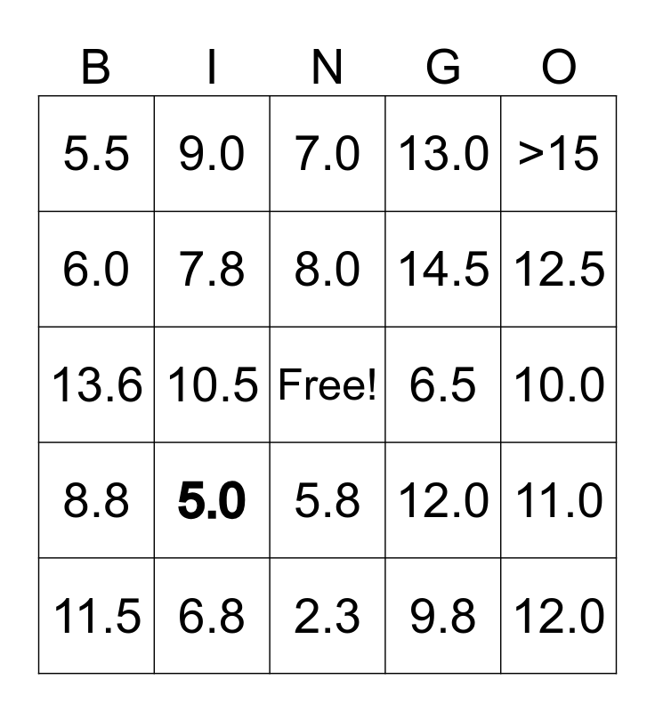 This bingo card has a free space and 24 words: 5.0, 6.8, 8.0, 11.5, >15, 5.5, 6.0, 9.0, 6.5, 5.8, 14.5, 13.6, 12.0, 11.0, 7.8, 9.8, 10.0, 7.0, 12.5, 10.5, 12.0, 8.8, 13.0 and 2.3.