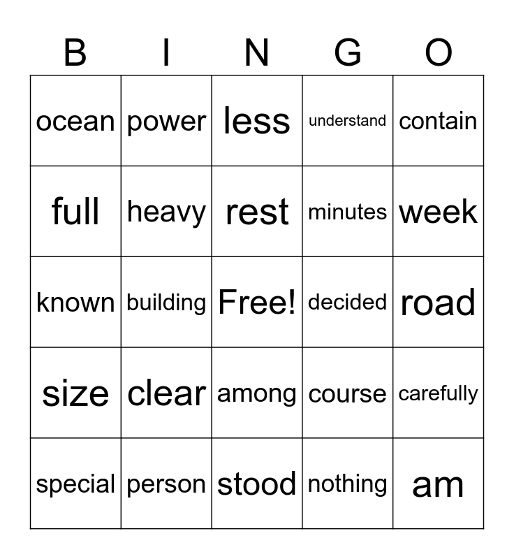 This bingo card has a free space and 100 words: done, English, road, half, ten, fly, gave, box, finally, wait, correct, oh, quickly, person, became, shown, minutes, strong, verb, stars, front, feel, fact, inches, street, decided, contain, course, surface, produce, building, ocean, class, note, nothing, rest, carefully, scientists, inside, wheels, stay, green, known, island, week, less, machine, base, ago, stood, plane, system, behind, ran, round, boat, game, force, brought, understand, warm, common, bring, explain, dry, though, language, shape, deep, thousands, yes, clear, equation, yet, government, filled, heat, full, hot, check, object, am, rule, among, noun, power, cannot, able, six, size, dark, ball, material, special, heavy, fine, pair, circle, include and built.