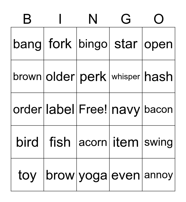 This bingo card has a free space and 29 words: toy, mojo, label, what, bang, bingo, older, fish, navy, brow, bacon, annoy, yoga, even, hash, pupil, acorn, bird, open, order, item, boy, whisper, brown, star, fork, swing, perk and omit.