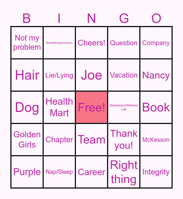 This bingo card has a free space and 24 words: Chapter, Nap/Sleep, Joe, Purple, Company, Not my problem, Hair, Backfill/replacement, Retirement/Retired Life, Team, Vacation, Dog, Thank you!, McKesson, Lie/Lying, Right thing, Book, Cheers!, Nancy, Health Mart, Integrity, Golden Girls, Question and Career.