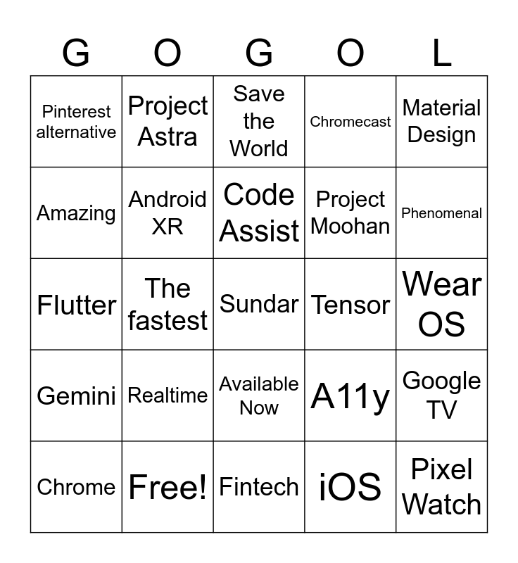 This bingo card has 30 words: Free!, x3 performance, The fastest, Google I/O Puzzle, Pinterest alternative, Save the World, Android XR, Available Now, Tensor, Fintech, Wear OS, Sundar, iOS, Pixel Watch, Phenomenal, Pixel 10, A11y, Gemini, Realtime, Material Design, Flutter, Low code AI prototyping, Project Astra, Project Moohan, Amazing, Chromecast, Google TV, Chrome, Code Assist and Apple mentioned.