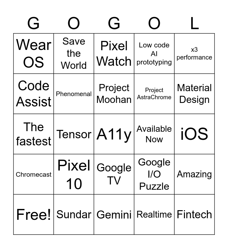 This bingo card has 29 words: Free!, Android XR, Tensor, Fintech, Wear OS, Pixel Watch, Phenomenal, Pixel 10, Available Now, Sundar, iOS, A11y, Gemini, Realtime, Material Design, Flutter, Google TV, Chromecast, x3 performance, The fastest, Google I/O Puzzle, Apple mentioned, Project AstraChrome, Code Assist, Low code AI prototyping, Save the World, Amazing, Project Moohan and Pinterest alternative.
