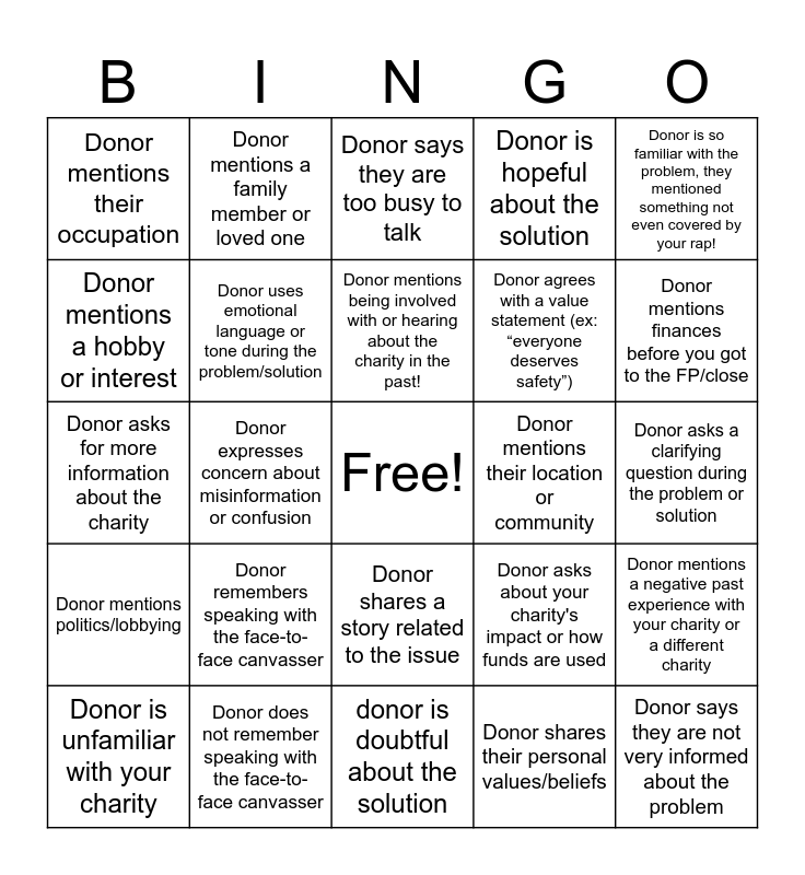 This bingo card has a free space and 24 words: Donor remembers speaking with the face-to-face canvasser, Donor does not remember speaking with the face-to-face canvasser, Donor mentions being involved with or hearing about the charity in the past!, Donor is unfamiliar with your charity, Donor is so familiar with the problem, they mentioned something not even covered by your rap!, Donor mentions their occupation, Donor mentions a hobby or interest, Donor mentions a family member or loved one, Donor mentions their location or community, Donor shares a story related to the issue, Donor agrees with a value statement (ex: “everyone deserves safety”), Donor asks for more information about the charity, Donor asks about your charity's impact or how funds are used, Donor mentions a negative past experience with your charity or a different charity, Donor uses emotional language or tone during the problem/solution, Donor shares their personal values/beliefs, Donor asks a clarifying question during the problem or solution, Donor says they are too busy to talk, Donor mentions finances before you got to the FP/close, Donor expresses concern about misinformation or confusion, Donor says they are not very informed about the problem, Donor mentions politics/lobbying, Donor is hopeful about the solution and donor is doubtful about the solution.