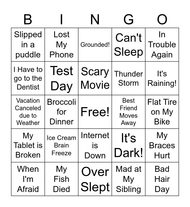 This bingo card has a free space and 29 words: When I'm Afraid, The Dog Ate My Homework, Broccoli for Dinner, Lost my shoe, Slipped in a puddle, Grounded!, Test Day, Ice Cream Brain Freeze, Best Friend Moves Away, My Fish Died, Flat Tire on My Bike, Bad Hair Day, Over Slept, Mad at My Sibling, It's Raining!, Lost our Game, Internet is Down, My Tablet is Broken, In Trouble Again, Vacation Canceled due to Weather, It's Dark!, I'm Late for Class, Thunder Storm, I Have to go to the Dentist, Can't Sleep, Lost My Phone, My Braces Hurt, Scary Movie and Skinned my Knee.