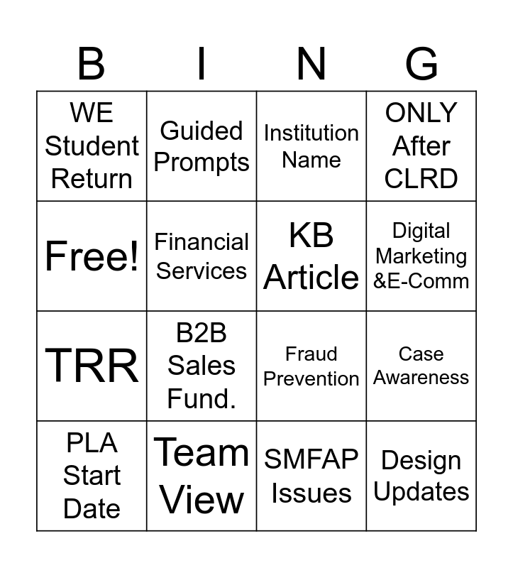 This bingo card has 16 words: Team View, Case Awareness, Institution Name, WE Student Return, TRR, Guided Prompts, Fraud Prevention, SMFAP Issues, Free!, Financial Services, PLA Start Date, ONLY After CLRD, B2B Sales Fund., Digital Marketing &E-Comm, KB Article and Design Updates.