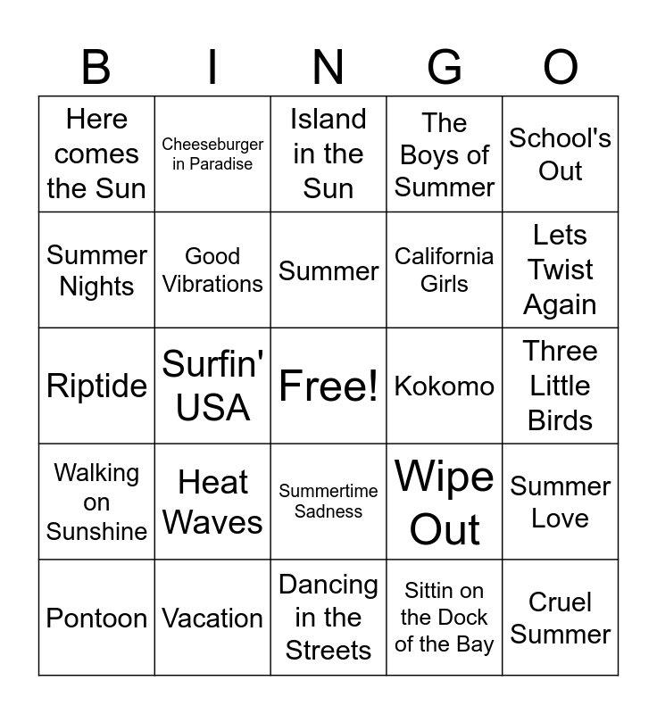This bingo card has a free space and 24 words: Pontoon, Heat Waves, Summer, Sittin on the Dock of the Bay, School's Out, Here comes the Sun, Cheeseburger in Paradise, Island in the Sun, Kokomo, Three Little Birds, Riptide, Good Vibrations, Wipe Out, Summer Love, Summer Nights, Vacation, Dancing in the Streets, The Boys of Summer, Lets Twist Again, Walking on Sunshine, Surfin' USA, Summertime Sadness, California Girls and Cruel Summer.