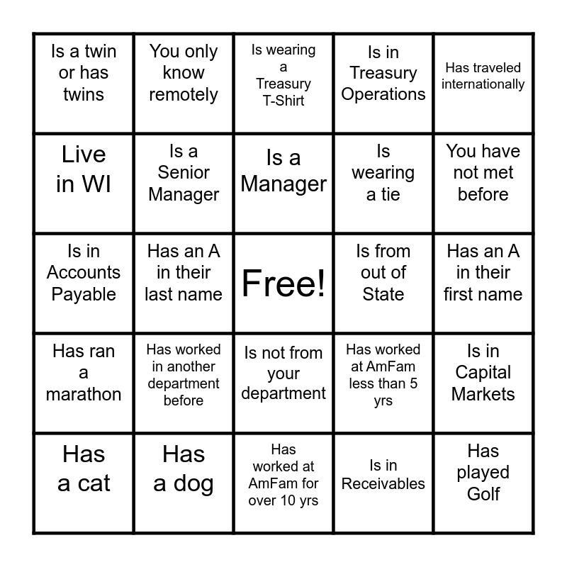This bingo card has a free space and 28 words: Is in Capital Markets, Is wearing a Treasury Polo, Is wearing a tie, Is in Receivables, Live in WI, Is wearing a Treasury T-Shirt, You only know remotely, Has ran a marathon, Is from out of State, Has a cat, Is in Accounts Payable, Is in Treasury Operations, Has a dog, Has worked at AmFam for over 10 yrs, You have not met before, Is in Treasury Compliance, Has worked in another department before, Is a Senior Manager, Is a Manager, Is not from your department, Is a twin or has twins, Never played Golf, Has played Golf, Has an A in their last name, Has an A in their first name, Has worked at AmFam less than 5 yrs, Has traveled internationally and Has traveled to more than 5 states.
