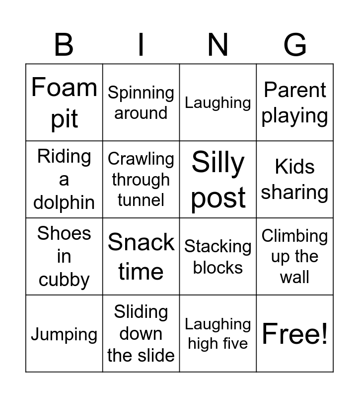 This bingo card has 16 words: Sliding down the slide, Climbing up the wall, Laughing, Foam pit, Shoes in cubby, Spinning around, Stacking blocks, Laughing high five, Riding a dolphin, Crawling through tunnel, Jumping, Parent playing, Snack time, Kids sharing, Silly post and Free!.