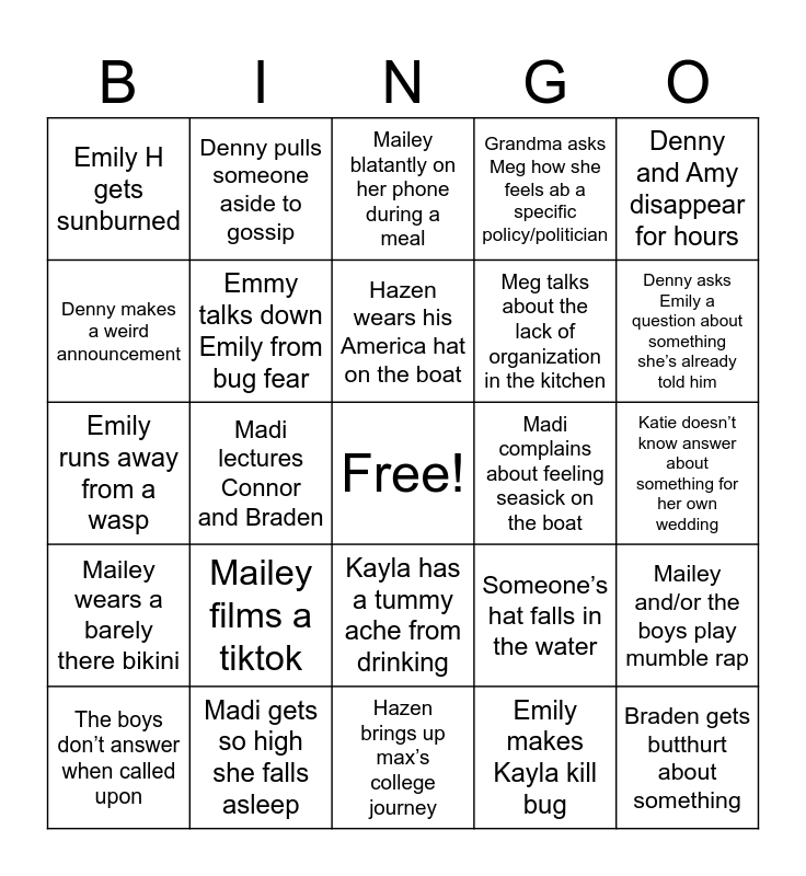 This bingo card has a free space and 24 words: Mailey films a tiktok, Madi gets so high she falls asleep, Hazen wears his America hat on the boat, The boys don’t answer when called upon, Denny and Amy disappear for hours, Emily H gets sunburned, Denny makes a weird announcement, Denny pulls someone aside to gossip, Madi complains about feeling seasick on the boat, Kayla has a tummy ache from drinking, Meg talks about the lack of organization in the kitchen, Emily runs away from a wasp, Someone’s hat falls in the water, Mailey and/or the boys play mumble rap, Emmy talks down Emily from bug fear, Emily makes Kayla kill bug, Katie doesn’t know answer about something for her own wedding, Mailey blatantly on her phone during a meal, Denny asks Emily a question about something she’s already told him, Madi lectures Connor and Braden, Braden gets butthurt about something, Mailey wears a barely there bikini, Grandma asks Meg how she feels ab a specific policy/politician and Hazen brings up max’s college journey.
