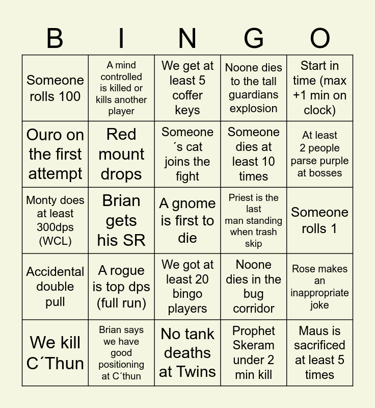 This bingo card has 29 words: We kill C´Thun, Not more than 3 wipes, Brian gets his SR, Maus is sacrificed at least 5 times, Someone rolls 100, We get at least 5 coffer keys, Red mount drops, A rogue is top dps (full run), Priest is the last man standing when trash skip, Brian says we have good positioning at C´thun, Someone rolls 1, A gnome is first to die, No tank deaths at Twins, Prophet Skeram under 2 min kill, At least 2 people parse purple at bosses, Enchant gloves formula drops, We got at least 20 bingo players, Accidental double pull, Start in time (max +1 min on clock), Monty does at least 300dps (WCL), Noone dies in the bug corridor, At least 2 SR-s drop for a boss, Someone dies at least 10 times, Ouro on the first attempt, Noone dies to the tall guardians explosion, A mind controlled is killed or kills another player, Rose makes an inappropriate joke, Someone´s cat joins the fight and Healers get hit by exploding bugs at Twins.