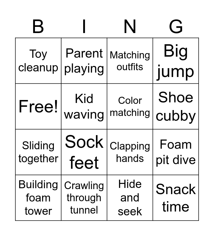 This bingo card has 16 words: Crawling through tunnel, Foam pit dive, Matching outfits, Toy cleanup, Sliding together, Parent playing, Clapping hands, Hide and seek, Free!, Kid waving, Building foam tower, Big jump, Sock feet, Shoe cubby, Color matching and Snack time.