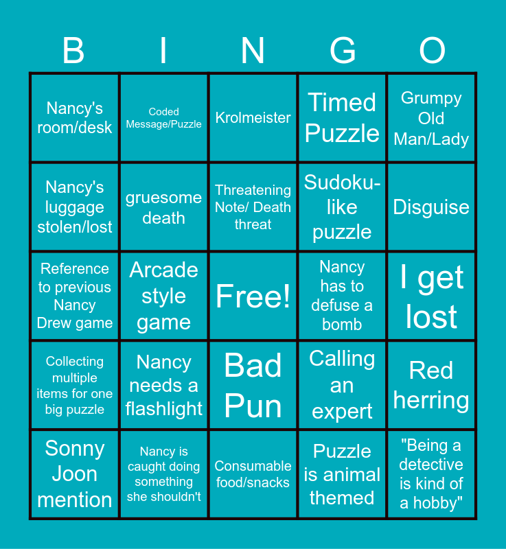 This bingo card has a free space and 74 words: Nancy being a Lib, Koko kringle bars, Krolmeister, Nancy doesnt believe in ghost, "Its Locked", "Thats Done!"/ "Did that!", Secret Tunnel/Passage way, Peeping Hole, Sonny Joon mention, "My mom died when I was young too", Nancy does a crime, Noisy Nancy, Threatening Note/ Death threat, Nancy's luggage stolen/lost, Doing Chores, Arcade style game, Chef/food mini game, Disguise, Music Mini game, Reference to previous Nancy Drew game, gruesome death, Coded Message/Puzzle, Timed Puzzle, Slider Puzzle, "Being a detective is kind of a hobby", Picture of a real person, Nancy is locked out, Snooping through a person's belongings, Nancy is knocked out/attacked, Calling Bess & George, Grumpy Old Man/Lady, Calling Ned, Nancy is hired to do this mystery, Nancy stumbles into this mystery, Bess swooning after a random guy, Puzzle is animal themed, "Dear xyz", Tragic Backstory, Classic Cops being useless, Nancy interacting with an animal, Consumable food/snacks, Nancy is caught doing something she shouldn't, Fetch quest/ Goose chase, Nancy ask insensitive question, Easter Egg, Nancy's room/desk, Historical Event/Person Reference, Nancy needs a flashlight, Sassy Nancy, Life or Death Puzzle, Nancy "sent home" death, Skelly mans, I get lost, Jumpscare, Someone gets Nancy's name wrong, Boardgame, Bad Pun, Villain Monologue, Hardy boys mention/appearance, Red herring, Sudoku-like puzzle, Pipe puzzle, Collecting multiple items for one big puzzle, Cog Puzzle, Nancy has to defuse a bomb, Banger soundtrack/ music, Rare Togo mention, Brute forces solution, Calling an expert, Reference to Nancy's red/titian hair, Calling Carson Drew, Randomized Puzzle, Crushed to Death and Nancy gets cursed.