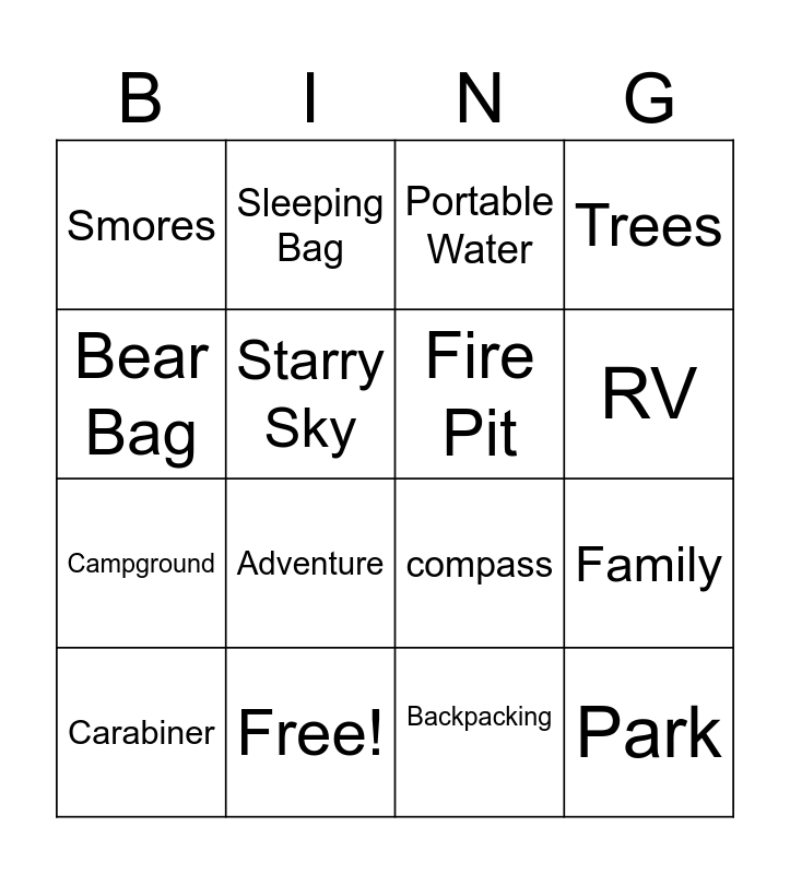 This bingo card has 25 words: Adventure, Tent, RV, Cook Out, Bear Bag, Smores, Starry Sky, Sleeping Bag, Free!, picnic table, Campground, compass, Hiking, Camp Stove, Fire Pit, Bug spray, Backpacking, Portable Water, Adventure, Family, Carabiner, Memoires, Park, Trees and Animals.