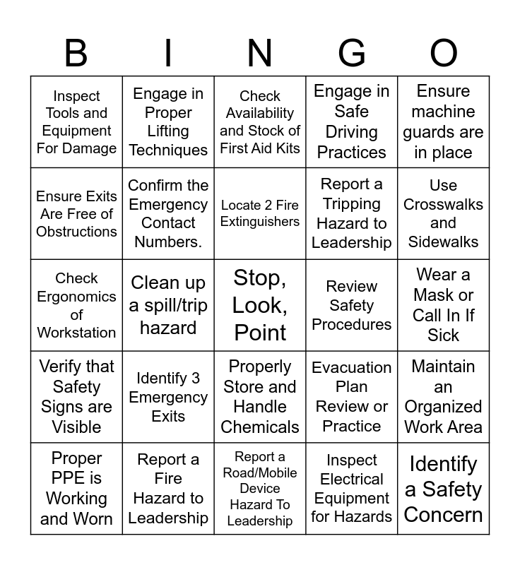 This bingo card has a free space and 24 words: Identify 3 Emergency Exits, Report a Fire Hazard to Leadership, Locate 2 Fire Extinguishers, Proper PPE is Working and Worn, Ensure machine guards are in place, Inspect Tools and Equipment For Damage, Ensure Exits Are Free of Obstructions, Engage in Proper Lifting Techniques, Review Safety Procedures, Properly Store and Handle Chemicals, Report a Tripping Hazard to Leadership, Check Ergonomics of Workstation, Evacuation Plan Review or Practice, Maintain an Organized Work Area, Confirm the Emergency Contact Numbers., Inspect Electrical Equipment for Hazards, Wear a Mask or Call In If Sick, Check Availability and Stock of First Aid Kits, Use Crosswalks and Sidewalks, Clean up a spill/trip hazard, Identify a Safety Concern, Verify that Safety Signs are Visible, Engage in Safe Driving Practices and Report a Road/Mobile Device Hazard To Leadership.
