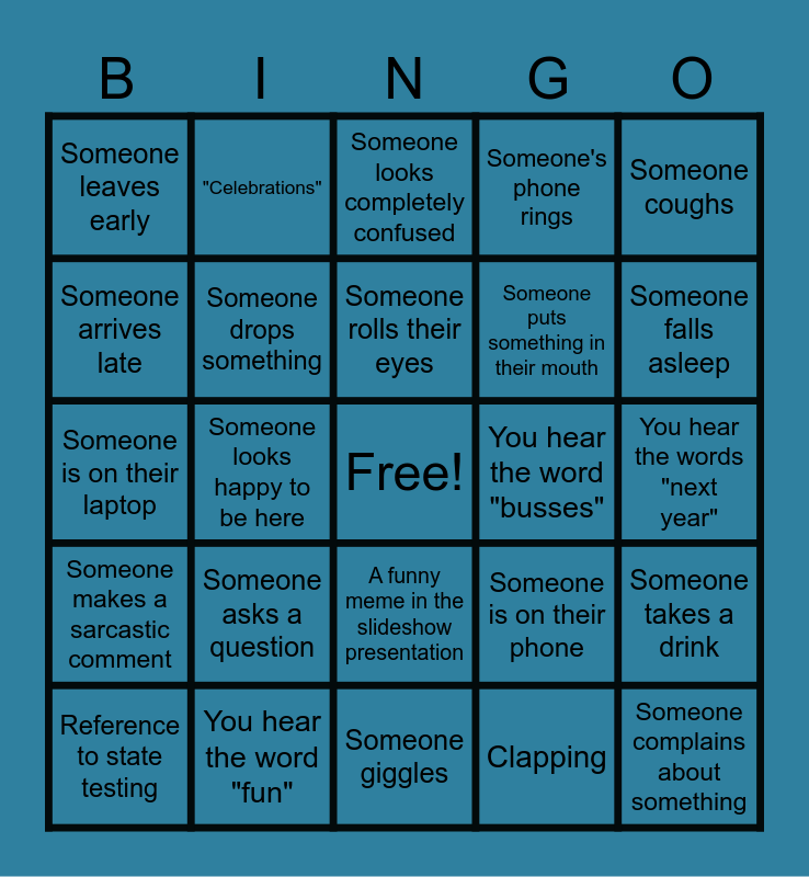 This bingo card has a free space and 24 words: Someone asks a question, You hear the word "fun", Someone rolls their eyes, Reference to state testing, Someone coughs, Someone leaves early, Someone arrives late, "Celebrations", You hear the word "busses", A funny meme in the slideshow presentation, Someone puts something in their mouth, Someone is on their laptop, Someone is on their phone, Someone takes a drink, Someone drops something, Clapping, You hear the words "next year", Someone looks completely confused, Someone falls asleep, Someone looks happy to be here, Someone complains about something, Someone makes a sarcastic comment, Someone's phone rings and Someone giggles.