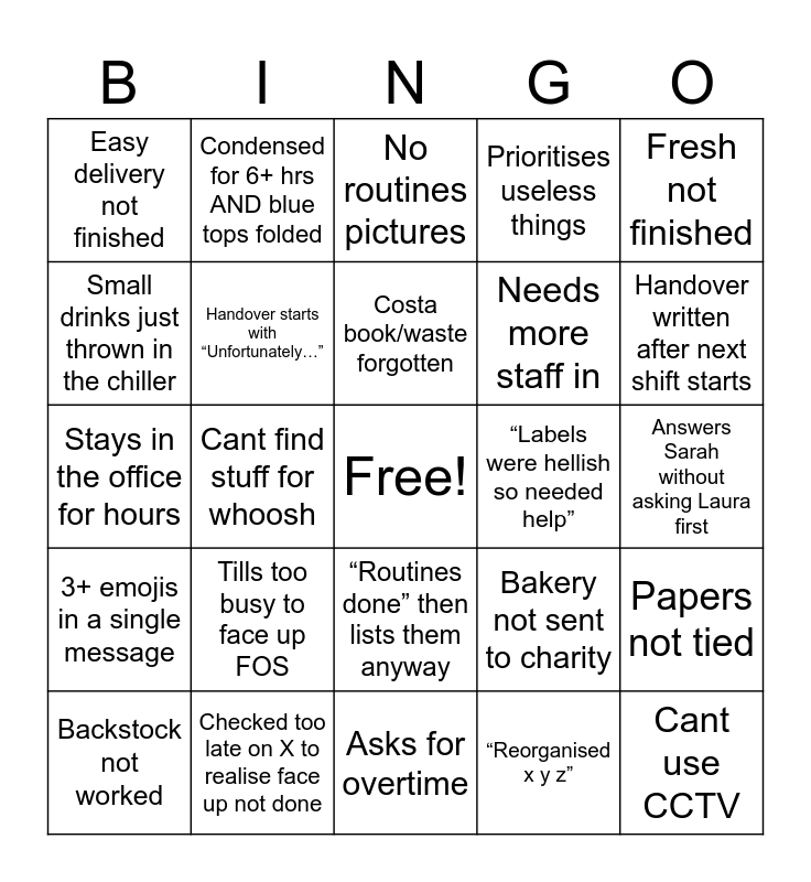 This bingo card has a free space and 24 words: Tills too busy to face up FOS, Checked too late on X to realise face up not done, Costa book/waste forgotten, Backstock not worked, Fresh not finished, Easy delivery not finished, Small drinks just thrown in the chiller, Condensed for 6+ hrs AND blue tops folded, “Labels were hellish so needed help”, “Routines done” then lists them anyway, Needs more staff in, Stays in the office for hours, Bakery not sent to charity, Papers not tied, Handover starts with “Unfortunately…”, “Reorganised x y z”, Answers Sarah without asking Laura first, No routines pictures, Handover written after next shift starts, Cant find stuff for whoosh, Cant use CCTV, 3+ emojis in a single message, Prioritises useless things and Asks for overtime.