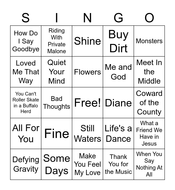 This bingo card has a free space and 39 words: Don't Give Up on Me, Call Me, She Used to Be Mine, Quiet Your Mind, Defying Gravity, Still Waters, Flowers, Gideon Brown, Monsters, All For You, Bad Thoughts, Buy Dirt, When You Say Nothing At All, Coward of the County, Diane, Fine, Gonna Be Okay, How Do I Say Goodbye, Irreplaceable, Life's a Dance, Loved Me That Way, Make You Feel My Love, Me and God, Meet In the Middle, The Middle, Numb Little Bug, The Old Rugged Cross, Part of Me, Pointless, Riding With Private Malone, Ring Pop, She's in Love with the Boy, Shine, Some Days, Thank You for the Music, Travellin' Soldier, What a Friend We Have in Jesus, You Can't Roller Skate in a Buffalo Herd and You'd Never Know.