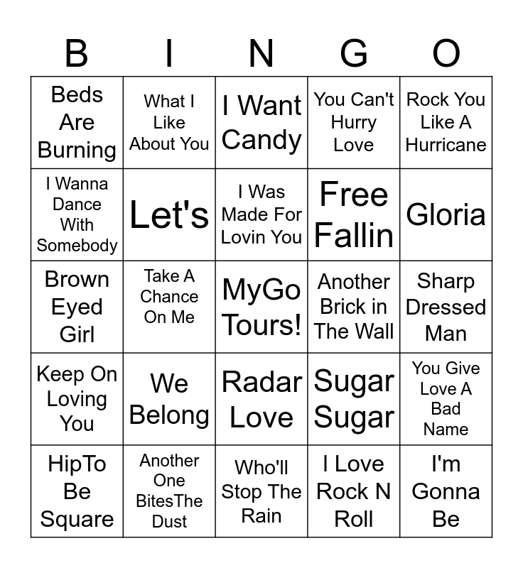 This bingo card has a free space and 62 words: Shook Me All Night Long, Another One BitesThe Dust, Don't Stop Believin, Keep On Loving You, Jack & Diane, Every Breath You Take, Let's, I still haven't found what I am looking for, Free Fallin, Africa, You Can't Hurry Love, Wake ME Up Before You GOGO, I Wanna Dance With Somebody, We Built This City, Summer of 69, Beds Are Burning, I'm Gonna Be, Rock You Like A Hurricane, Cherry Pie, I Was Made For Lovin You, Another Brick in The Wall, I Want Candy, HipTo Be Square, l Love Rock N Roll, The Look, Centerfold, Jessie's Girl, Take On Me, You Give Love A Bad Name, She Drives Me Crazy, Fat Bottomed Girls, Life is a Highway, Gimme All Your Lovin, Mony Mony, Sharp Dressed Man, What I Like About You, Bad To The Bone, I Want You To Want Me, Take A Chance On Me, Hurts So Good, Brown Eyed Girl, Hotel California, We Belong, Play That Funky Music, Gloria, Sugar Sugar, Pretty Woman, Wild Thing, I Just Died In Your Arms Tonight, Love Shack, Radar Love, Who'll Stop The Rain, Do Ya Think I'm Sexy, You Spin Me Around, YMCA, Girls Just Wanna Have Fun, LOLA, Just What I Needed, Brown Sugar, Mamma Mia, Blue Suede Shoes and I'm Too Sexy (yes you are):).