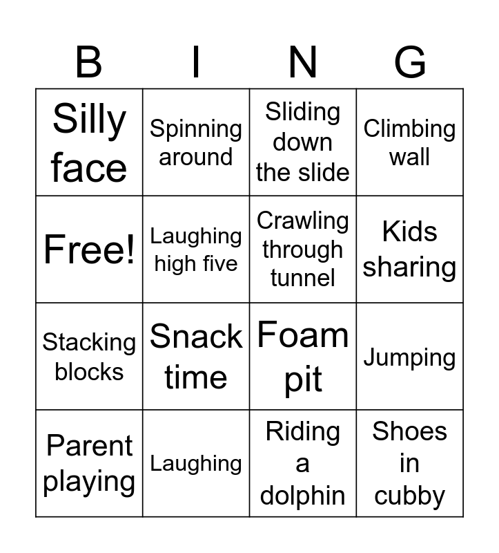 This bingo card has 16 words: Laughing, Jumping, Sliding down the slide, Silly face, Stacking blocks, Spinning around, Foam pit, Riding a dolphin, Free!, Laughing high five, Parent playing, Climbing wall, Snack time, Kids sharing, Crawling through tunnel and Shoes in cubby.