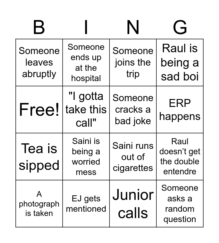 This bingo card has 16 words: EJ gets mentioned, Raul doesn’t get the double entendre, Someone joins the trip, Someone leaves abruptly, Tea is sipped, Someone ends up at the hospital, Saini runs out of cigarettes, Junior calls, Free!, "I gotta take this call", A photograph is taken, Raul is being a sad boi, Saini is being a worried mess, ERP happens, Someone cracks a bad joke and Someone asks a random question.