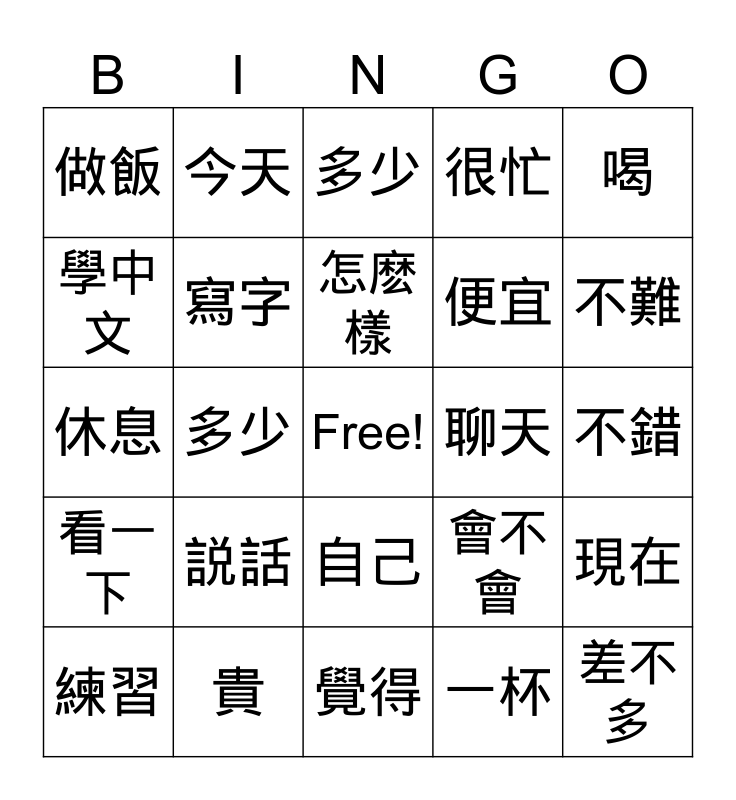 This bingo card has a free space and 29 words: 練習, 幾月幾號, 多少, 有一點, 做飯, 多少, 寫字, 説話, 聊天, 貴, 不錯, 差不多, 覺得, 一杯, 不難, 咖啡, 自己, 看一下, 喝, 休息, 會不會, 快慢, 便宜, 學中文, 很忙, 今天, 現在, 怎麽樣 and 還會.