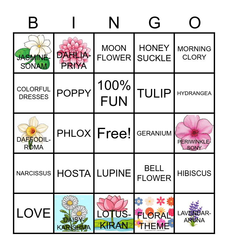 This bingo card has 17 images, a free space and 44 words: ROSE, LAVENDAR-ARUNA, SNOWDROP-NEHA, LOVE, FRIENDS, FLORAL THEME, MOON FLOWER, SUNFLOWER-SHOBHA, MORNING CLORY, DAISY-KARISHMA, HONEY SUCKLE, GERANIUM, LUPINE, HOSTA, CALENDULA, LOTUS-KIRAN, ORCHID-SIMRAN, DAFFODIL-ROMA, MARIGOLD- ROSHINI, HYDRANGEA, DAHLIA-PRIYA, SALVIA, CAMELIA-RENU, JASMINE-SONAM, PEONY, PERIWINKLE-SONY, PRIMROSE-SUNAINA, LANATANA-KOMAL, BELL FLOWER, NARCISSUS, LAMIUM, HIBISCUS, LOBELIA, PARTY, PHLOX, DAHLIA, POPPY, COFFEE TIME, 100% FUN, COLORFUL DRESSES, TULIP, GAMES, POPPY and FLOWER CROWN.
