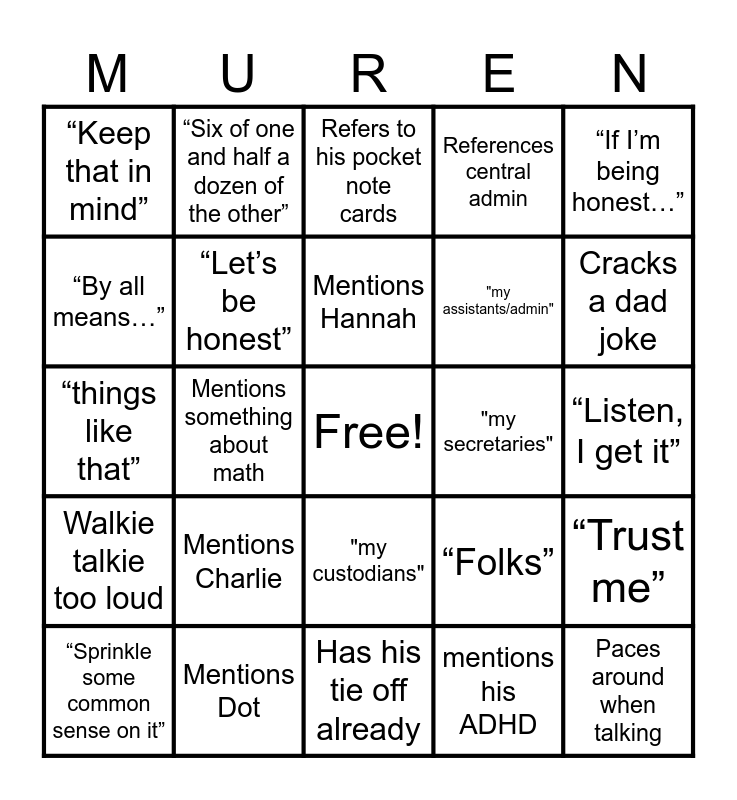 This bingo card has a free space and 24 words: Mentions Charlie, Mentions Dot, Mentions Hannah, “Sprinkle some common sense on it”, “If I’m being honest…”, “Keep that in mind”, “By all means…”, “Six of one and half a dozen of the other”, "my secretaries", "my custodians", "my assistants/admin", “things like that”, “Folks”, “Trust me”, “Let’s be honest”, mentions his ADHD, “Listen, I get it”, Refers to his pocket note cards, Cracks a dad joke, Mentions something about math, Paces around when talking, Walkie talkie too loud, References central admin and Has his tie off already.