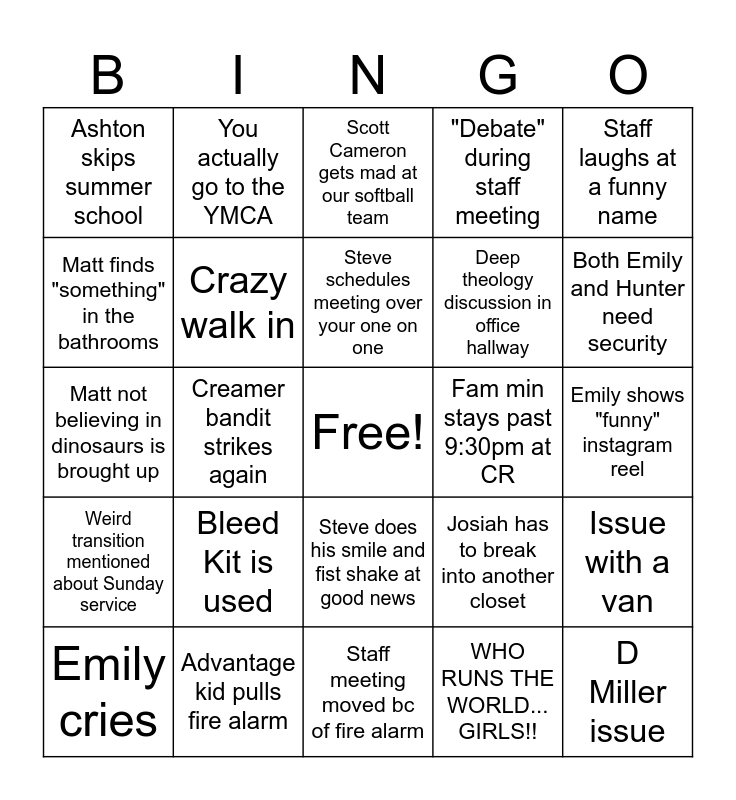 This bingo card has a free space and 24 words: Bleed Kit is used, Advantage kid pulls fire alarm, Steve schedules meeting over your one on one, Emily cries, Staff laughs at a funny name, Ashton skips summer school, Matt finds "something" in the bathrooms, You actually go to the YMCA, Fam min stays past 9:30pm at CR, Steve does his smile and fist shake at good news, Deep theology discussion in office hallway, Matt not believing in dinosaurs is brought up, Josiah has to break into another closet, Issue with a van, Crazy walk in, WHO RUNS THE WORLD... GIRLS!!, Emily shows "funny" instagram reel, Scott Cameron gets mad at our softball team, Both Emily and Hunter need security, Creamer bandit strikes again, D Miller issue, Weird transition mentioned about Sunday service, "Debate" during staff meeting and Staff meeting moved bc of fire alarm.