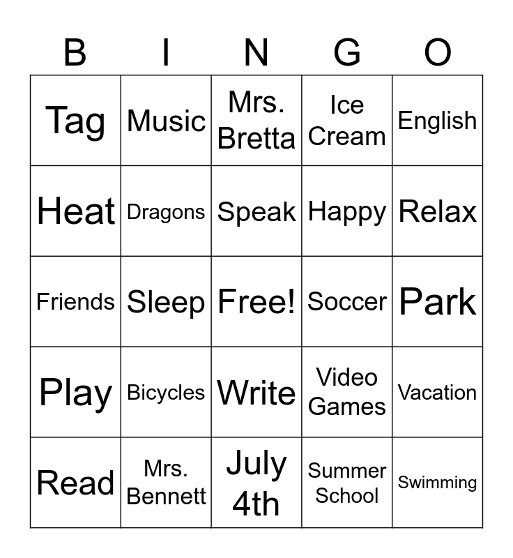 This bingo card has a free space and 39 words: Summer, Sunshine, Goodrich, Dragons, Read, Write, Speak, Listen, English, Play, Sleep, Ice Cream, Swimming, Park, Soccer, Bicycles, Tetherball, Tag, Babysit, Video Games, Heat, July 4th, Happy, Relax, Bored, Water, Air Conditioning, Phones, Snacks, Music, Party, Mrs. Ives, Mrs. Bretta, Mrs. Bennett, Summer School, Mall, Vacation, Friends and Family.