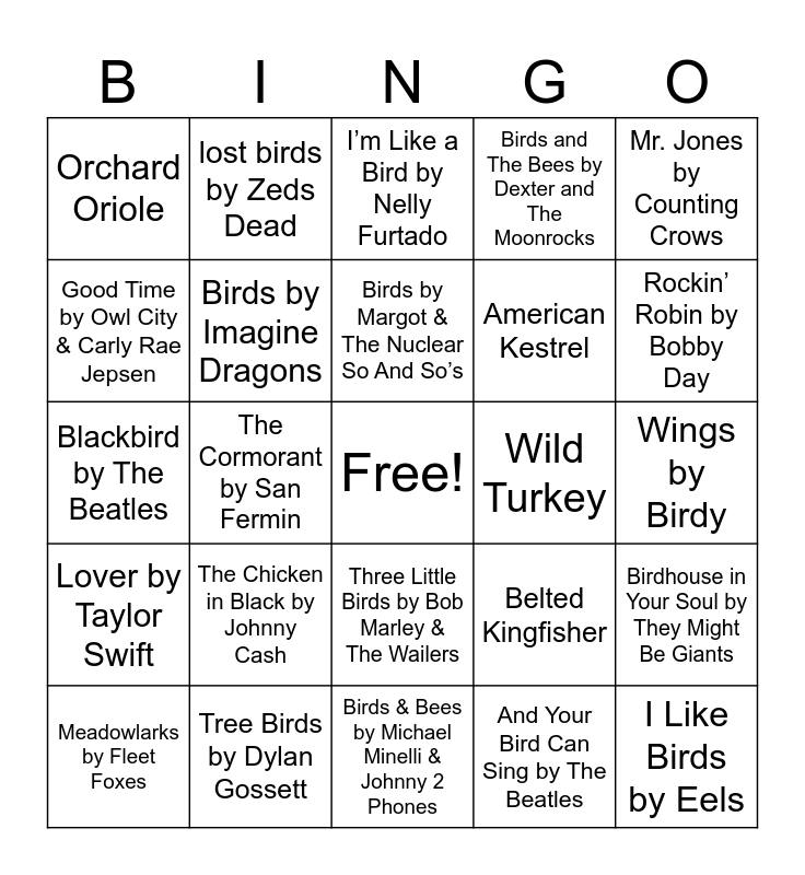 This bingo card has a free space and 83 words: Northern Cardinal, Turn! Turn! Turn! by The Byrds, I’m Like a Bird by Nelly Furtado, Surfin’ Bird by The Trashmen, Blue Jay, Sandhill Crane, Bird Machine by DJ Snake & Alesia, Cardinal by Mt. Joy, Mockingbird by Eminem, The Bird Hunters by Turnpike Troubadours, Hotel California by Eagles, Bluebird by Miranda Lambert, Birds by Imagine Dragons, Wild Turkey, Watermelon Crawl by Tracy Byrd, Orchard Oriole, Meadowlarks by Fleet Foxes, Good Time by Owl City & Carly Rae Jepsen, Two Birds by Regina Spektor, Red-tailed Hawk, Shake It Off by Taylor Swift, American Kestrel, I Like Birds by Eels, Birding by Swet Shop Boys, The Cormorant by San Fermin, The Bird and the Worm by The Used, Free Bird by MOONLGHT, Bird Set Free by Sia, The Bird Song by King Gizzard & The Lizard Wizard, American Robin, The Chicken in Black by Johnny Cash, Wagon Wheel by Old Crow Medicine Show, Hanginaround by Counting Crows, Blackbird by The Beatles, Birds Dont Sing by TV Girl, Life in the Fast Lane by Eagles, Birds & Bees by Michael Minelli & Johnny 2 Phones, Eagle Feather by Ian Munsick, Rockin’ Robin by Bobby Day, Lover by Taylor Swift, Edge of Seventeen by Stevie Nicks, Red-winged Blackbird, Bird Song by Florence + The Machine, Hard to Handle by The Black Crowes, Fly Away by Lenny Kravitz, Fish in a Birdcage (Rule #4) by Fish in a Birdcage, lost birds by Zeds Dead, Black Catbird by the Garifuna Collective, Hummingbird by Wilco, Rose-breasted Grosbeak, Belted Kingfisher, Birds and The Bees by Dexter and The Moonrocks, Wings by Birdy, When Doves Cry by Prince, Take it Easy by Eagles, Birds of a Feather by Billie Eilish, House Wren, Bald Eagle, Tree Birds by Dylan Gossett, Isle of Flightless Birds by Twenty One Pilots, Fireflies by Owl City, Shrike by Hozier, Little Sparrow by Dolly Parton, Mr. Jones by Counting Crows, Bird with a Broken Wing by Weezer, Birdhouse in Your Soul by They Might Be Giants, Hymn for the Weekend by Coldplay, Songbird by Aer, Western Meadowlark, Bluebird by Paul McCartney & Wings, Common Nighthawk, Brown Thrasher, Accidentally in Love by Counting Crows, Three Little Birds by Bob Marley & The Wailers, And Your Bird Can Sing by The Beatles, Big Yellow Taxi by Counting Crows, High Flying Bird by Elton John, Birds by Margot & The Nuclear So And So’s, Northern Flicker, Cruel Summer by Taylor Swift, The Bird Song by Noah Floersch, Swan Upon Leda by Hozier and Whip-poor-will.