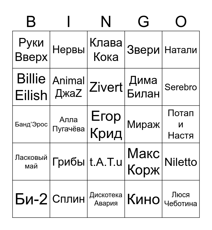 This bingo card has a free space and 24 words: Би-2, Грибы, Zivert, Кино, Натали, Руки Вверх, Нервы, Клава Кока, Мираж, Потап и Настя, Банд’Эрос, Animal ДжаZ, Макс Корж, Niletto, Billie Eilish, Сплин, Дискотека Авария, Звери, Serebro, Ласковый май, Алла Пугачёва, t.A.T.u, Дима Билан and Люся Чеботина.
