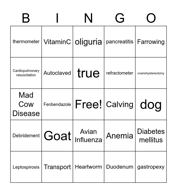 This bingo card has a free space and 24 words: Goat, Transport, true, Leptospirosis, Farrowing, thermometer, Cardiopulmonary resuscitation, VitaminC, Calving, Avian Influenza, refractometer, Mad Cow Disease, Anemia, Diabetes mellitus, Autoclaved, Duodenum, dog, oliguria, ovariohysterectomy, Fenbendazole, gastropexy, Debridement, pancreatitis and Heartworm.