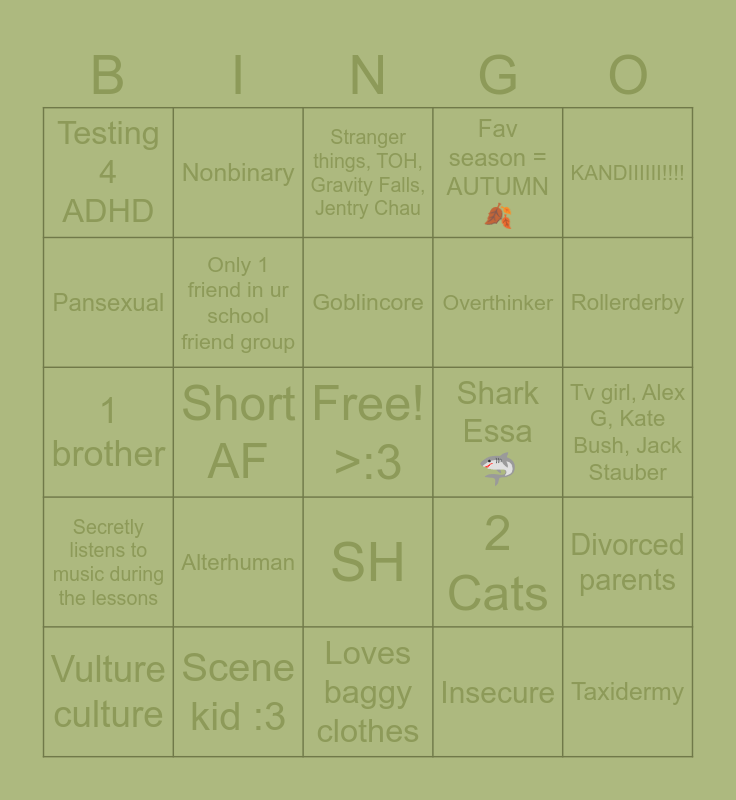 This bingo card has a free space and 24 words: Alterhuman, Scene kid :3, Goblincore, Vulture culture, KANDIIIIII!!!!, Testing 4 ADHD, Pansexual, Nonbinary, Shark Essa 🦈, SH, Overthinker, 1 brother, 2 Cats, Divorced parents, Only 1 friend in ur school friend group, Insecure, Tv girl, Alex G, Kate Bush, Jack Stauber, Stranger things, TOH, Gravity Falls, Jentry Chau, Rollerderby, Short AF, Taxidermy, Secretly listens to music during the lessons, Fav season = AUTUMN 🍂 and Loves baggy clothes.